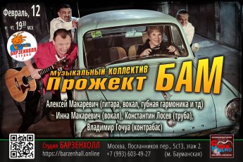 12 февраля впервые в студии «Барзенхолл» сыграет концерт музыкальный коллектив Прожект БАМ. Руководитель и автор коллектива Алексей Макаревич (гитара, вокал, губная гармоника и тд) — дипломант и лауреат разных бардовских фестивалей, в том числе лауреат Грушинского фестиваля.