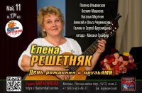 - 11.05 (пн 17:00) Елена РЕШЕТНЯК. День рождения с друзьями!Елена Решетняк – автор-исполнитель, педагог, журналист, организатор и руководитель Всероссийского детского фестиваля авторской песни «Слушай и скажи», лауреат всероссийских и международных конкурсов авторской песни. В концерте прозвучат старые и новые песни Елены Решетняк в исполнении автора и ее друзей: Алексея и Ольги Черемисовых, Ксении Машковой, Натальи Мкртчян, Полины Ильвовской, Галины и Сергея Брусницыных, Евгения и Петра Савельевых, Ларисы Ялынской. Аккомпанемент на гитаре – Михаил Грайфер.