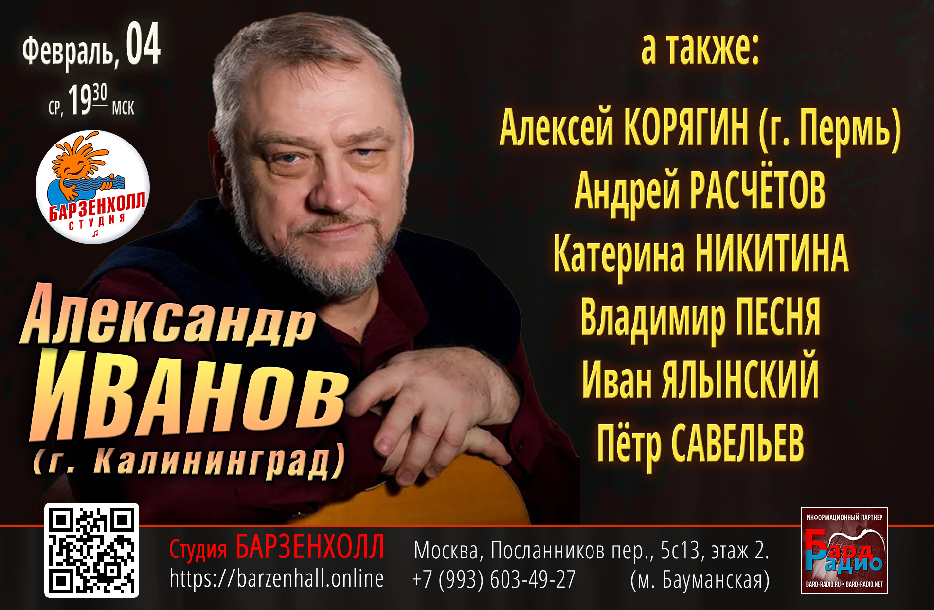 Александр Иванов («Саша-моряк») – известный бард, автор песен, композитор. Песни сочиняет с 1969 г. на свои стихи, а также на стихи профессиональных поэтов. Дипломант Первого Всесоюзного фестиваля в Саратове 1986 года. Играет на 6 и 7-струнной гитаре. Автор нескольких книг и музыкальных альбомов, изданных в разные годы.