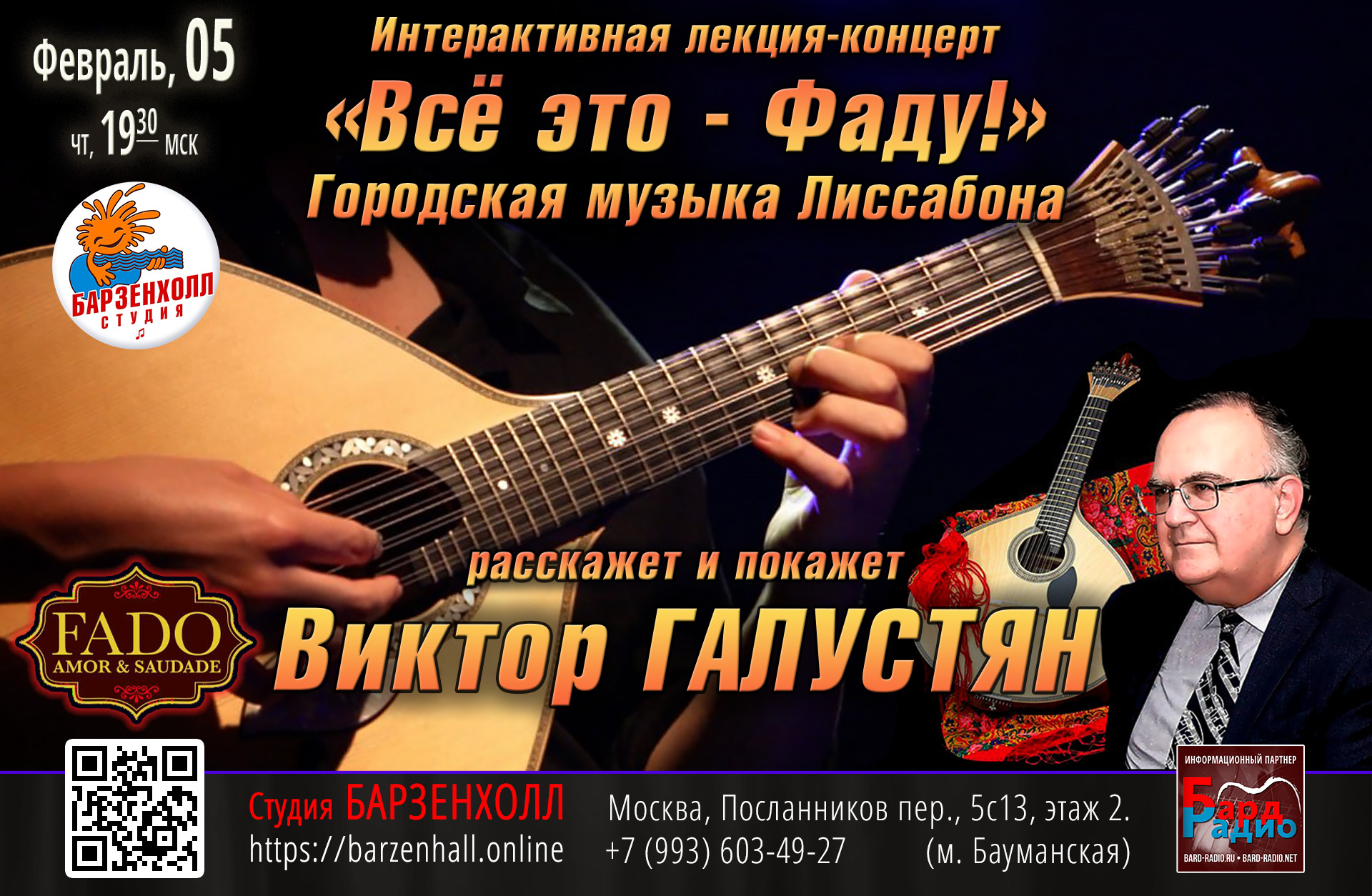 Виктор Галустян, преданный поклонник и большой знаток Фаду, проиллюстрирует свой рассказ обширным музыкальным видеоматериалом и в увлекательной манере познакомит зрителя с этим относительно молодым музыкальным направлением.