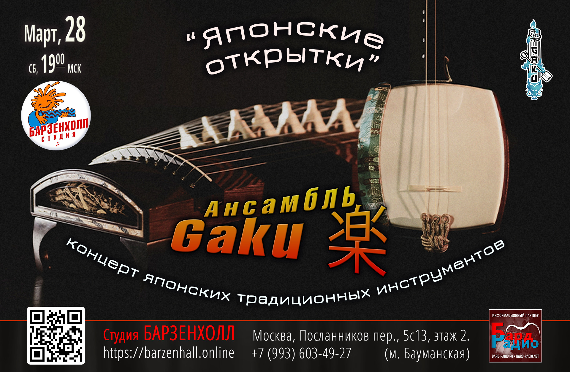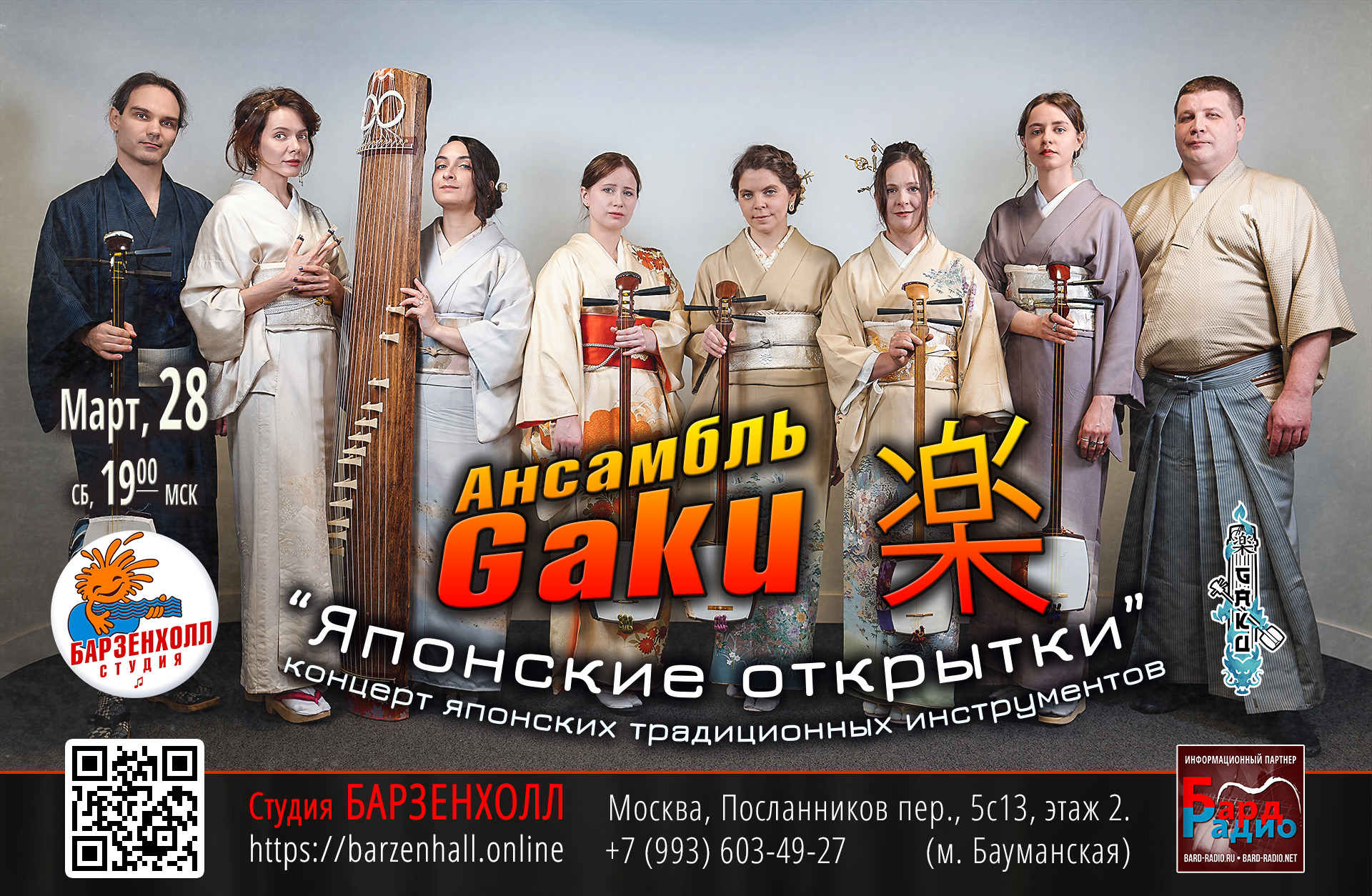 Ансамбль “Гаку” — это коллектив энтузиастов японских национальных инструментов — сямисэн и кото. Для концерта в Барзенхолле ансамбль «Гаку» составил программу из разнообразных, многогранных пьес, чтобы показать во всей красе возможности этих инструментов. Отобранные пьесы, как цветные открытки с разнообразными пейзажами и сюжетами, покажут и расскажут о разных уголках Японии и об особенностях ее завораживающей культуры.